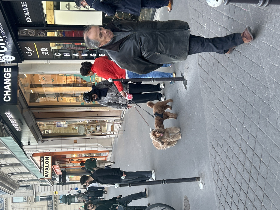 The scene depicts a pedestrian sidewalk in Paris, France, specifically near a "CHANGE" currency exchange office and an "AVALON PARIS maroquinerie" shop, located on a commercial street. The architecture features multi-story stone buildings with decorative facades above ground-level retail spaces. In the immediate foreground, a mature male with short, dark hair walks towards the left, looking downwards. He wears a dark, possibly leather, puffer jacket over a gray sweater, dark trousers, and brown shoes. In the mid-ground, slightly to the left of center, two dogs interact on a leash held by a person. The person, whose full face is obscured by sunglasses and a black helmet, wears a patterned gray and black jacket, a black scarf, and dark pants. They hold a red retractable leash that splits to connect to both dogs. The dog on the left is a medium-sized, long-haired, light brown spaniel-type with its tongue slightly visible, facing towards the right. The dog on the right is a smaller, reddish-brown poodle or poodle-mix type, wearing a dark harness, and is sniffing the face of the larger dog. A second person, visible from the back, stands near the dog handler, wearing a bright red puffer jacket and blue jeans. Further in the background, to the left, several other pedestrians are visible, including a man in a black jacket and a man in a green jacket walking away. A bicycle wheel is partially visible on the far left. The sidewalk is paved with a mix of square-patterned blocks in the foreground and smoother concrete further back. Black metal bollards delineate the pedestrian area. The "CHANGE" office features signs in multiple languages, including French, English, Arabic, and Chinese characters. A wooden display rack for "PANIER DES SENS" products stands outside a shop to the left of the currency exchange.