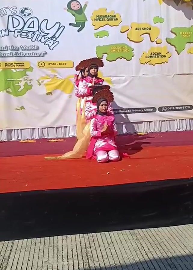 group of young girls performing a dance on an outdoor stage in what appears to be a school event. There are four girls dressed in matching pink and white traditional outfits, including hats. One girl is kneeling, while the others are standing and moving their arms. The dance seems to be a traditional Indonesian performance. A banner in the background indicates that the event is called "It's Bee Fun Day Festival" organized by Bunga Persada Primary School. The banner lists various activities, including a Musabaqah Hifzil Quran (memorization of the Quran competition), art show, market zone, coloring competition, and adzan competition. A man in a blue shirt is standing to the right, taking pictures or filming the performance with his phone. The stage is set up on a concrete surface in front of a building. The overall atmosphere suggests a school celebration or cultural event.