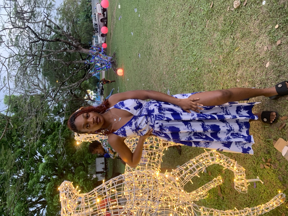 A young woman with braided hair poses in a blue and white dress beside a lit Christmas decoration. She wears a silver butterfly necklace and black slide sandals. The background features a grassy area with festive decorations, including lit trees and pink orbs. A parked white truck is visible further back. The scene appears to be an outdoor holiday celebration.