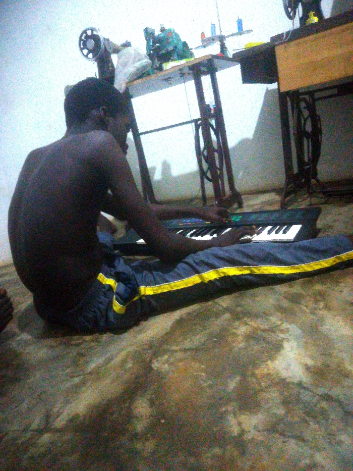 An indoor location in the city of Unknown, Unknown, features a single male individual. The male is dark-skinned, shirtless, and wears dark blue or black track pants with yellow stripes along the outer seams. He is seated directly on a rough concrete floor with his legs extended forward, positioned behind a black electronic musical keyboard. His hands are placed on the keyboard, with fingers on the keys and control panel. The individual's head is tilted downward, focusing on the keyboard. In the background, against a light-colored wall, two sewing machines are visible on elevated stands or tables. The left machine is on a dark metal frame, while the right machine is on a wooden-topped table. Spools of colorful thread are visible on a shelf or surface in the far background. The lighting is dim, and the floor exhibits varied tones, suggesting wear.