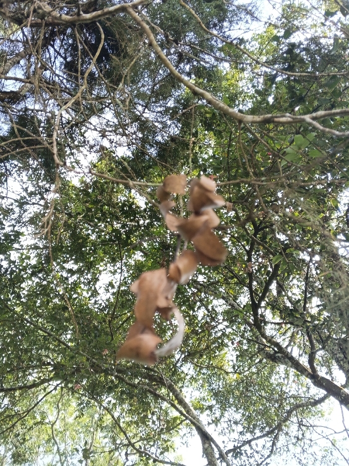 A low-angle shot captures a tree with many branches reaching up. The leaves are mostly green, except for some brown, dead leaves hanging down. The background is a mix of green and blue sky. Some branches are bare. The overall lighting is soft, possibly diffused by the foliage. The image appears to be taken during the daytime.