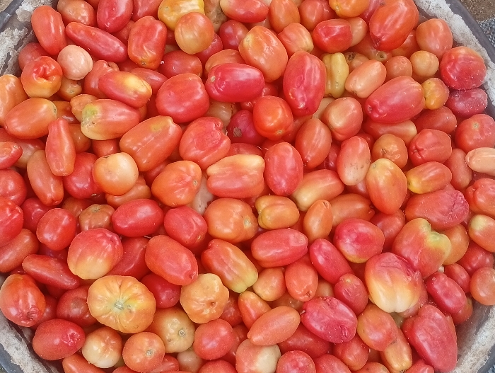 - "A large quantity of fresh tomatoes is densely piled within a dark-rimmed container, possibly a market basket or bin, in the city of Wamba, Nigeria" by FM-xL0Ov1, licensed under CC BY 4.0