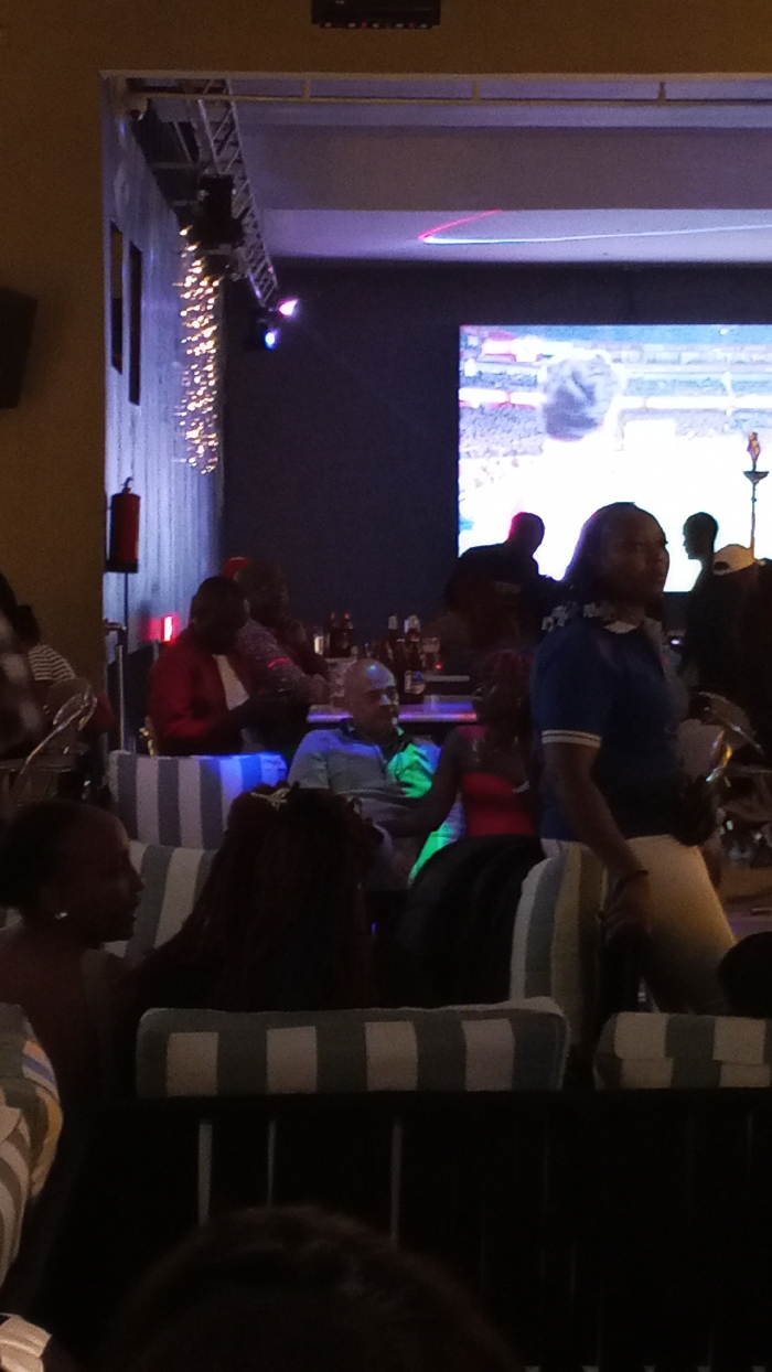 A dimly lit room with several people socializing is captured in the image. Seated on striped cushioned seats, individuals engage in conversations. A man in a red jacket and another with a bald head are visible. A woman in a blue shirt walks by. A large screen displays a bright, unclear image in the background, while string lights adorn the side. The overall ambiance suggests a bar or lounge setting.