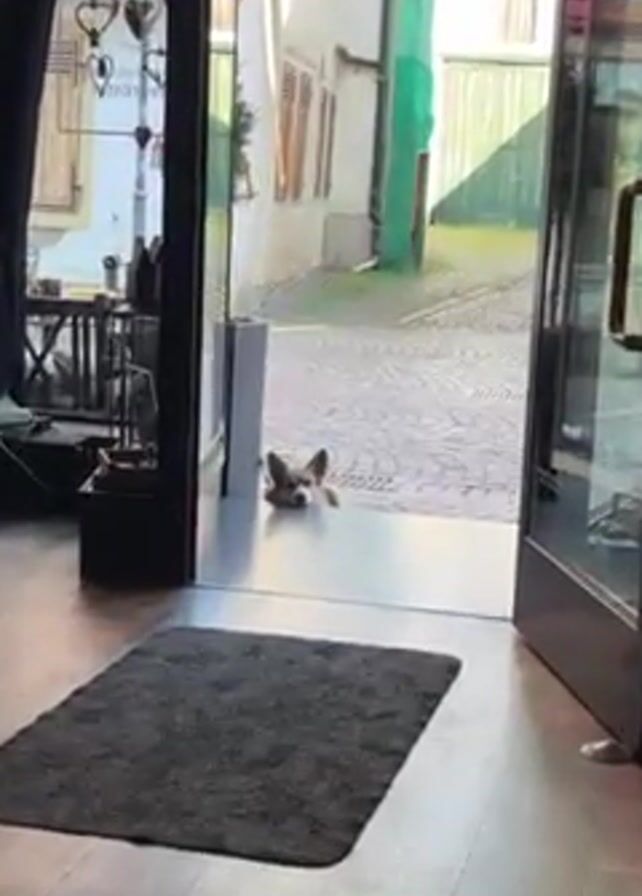 From inside a retail store, the camera faces a set of double doors opening to an outside walkway paved with gray bricks. A gray doormat lies on the store's tile floor. A corgi dog peers into the store from the outside walkway, resting its chin on the metal ledge of the doorway. In the background, an old building with wooden shutters and a metal utility shed can be seen. A child's babbling audio accompanies the scene.