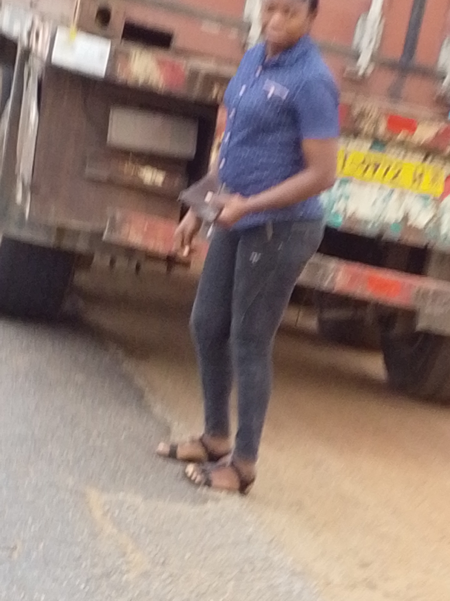 A woman is standing on a road in front of a large vehicle. She is wearing a short-sleeved, button-down blue shirt, dark-colored jeans, and sandals. She is holding a dark object in her hands. The vehicle behind her has a brown and rusted appearance, and some yellow markings are visible. The road surface appears to be asphalt. The location is Dungu, Ghana.