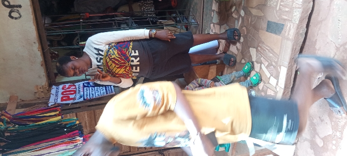 The image depicts an outdoor scene in the city of Nsukka, Nigeria, in front of a commercial establishment