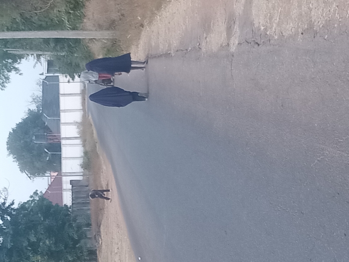 Two figures draped in dark fabric walk alongside a paved road. One figure appears smaller, possibly a child. Trees and buildings are visible on the roadside. A light-colored fence is partially visible behind some trees. A monkey walks on the roadside. The sky is overcast, suggesting a hazy or muted light.