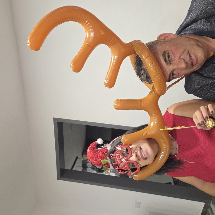 Two people wear inflatable reindeer antlers. The woman smiles, wears a red Christmas hat, and festive glasses. She holds a golden chocolate ball. The man beside her also smiles. They are indoors, posing in front of a doorway and a white wall. The overall impression is festive and cheerful.