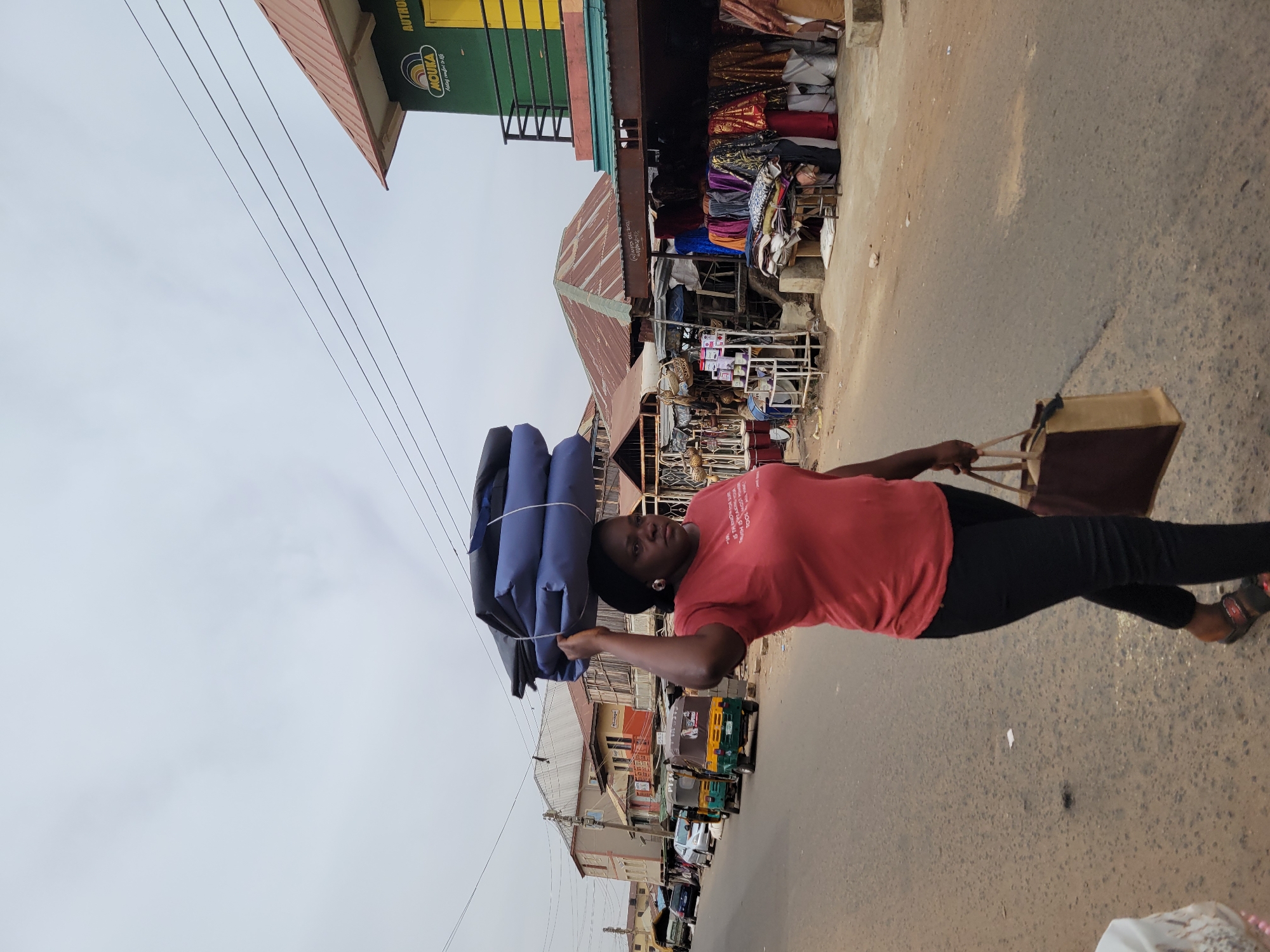 A woman walks from left to right on a paved road in a commercial district of Jos, Nigeria, under an overcast sky. She balances a stack of four dark blue, folded items, secured with white straps, on her head, with her left hand raised to steady the load. She wears a reddish-orange t-shirt with white text, black trousers, and dark sandals, carrying a brown and beige tote bag in her right hand. On the left side of the road, multiple vehicles, including two green and yellow tricycles (Keke Napep) and several cars, are visible alongside aged, multi-story buildings with corrugated metal roofs. On the right, a bright green building with a yellow door displays a "MOUKA" brand logo with a rainbow and "AUTHORISED" text. Adjacent to this building, market stalls line the street, exhibiting a variety of goods such as textiles, baskets, and other merchandise beneath rusty corrugated metal roofs. Overhead, power lines are visible.