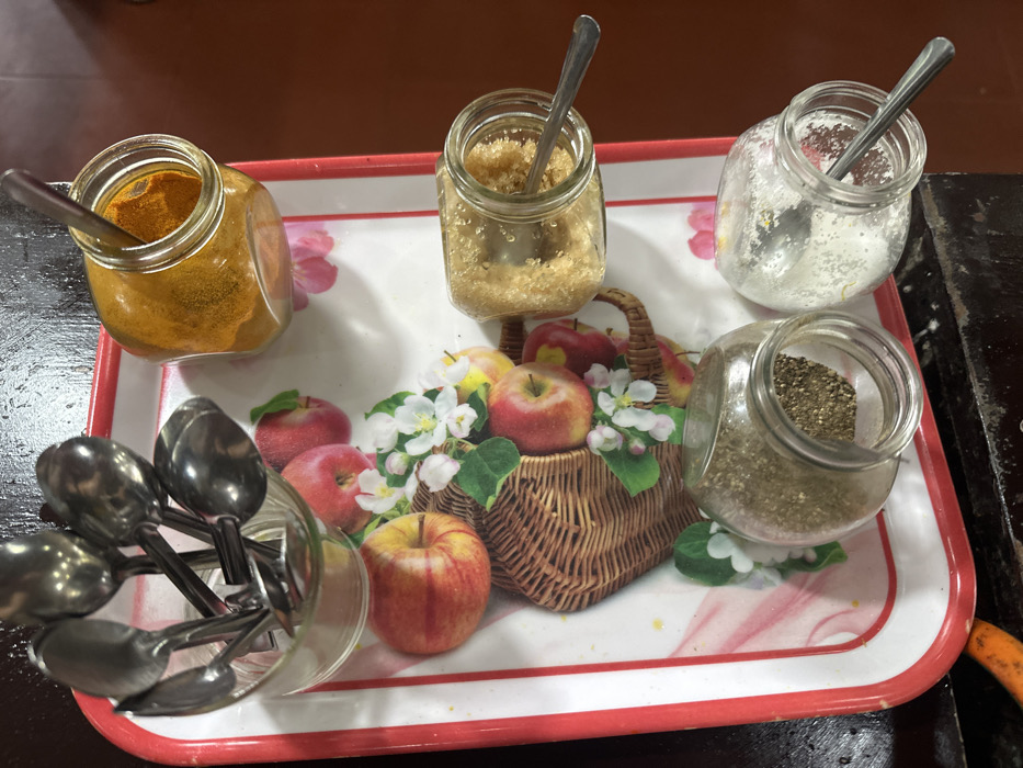 Four small jars with spoons sit on an apple-themed tray alongside a glass of additional spoons. The jars contain turmeric, brown sugar, white sugar, and pepper. A small woven basket with apples and apple blossoms decorates the tray's center. The tray has a white background with a red trim. It rests on a dark surface.