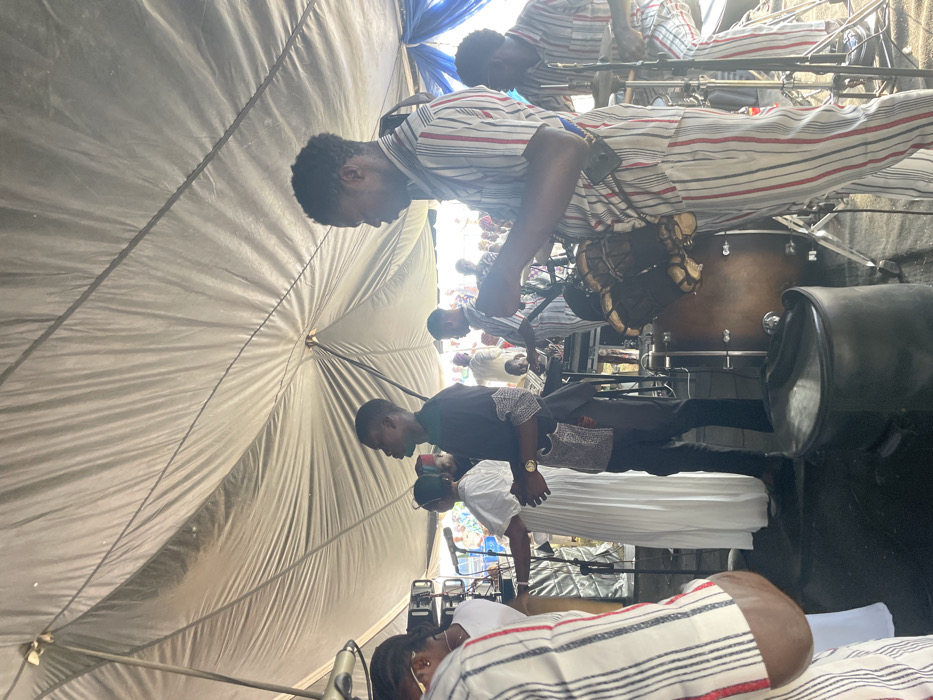 Under a large white tent, a group of people are gathered. Several men stand in the center of the frame wearing striped shirts and pants, playing instruments like drums. A man in a black shirt stands nearby, with a woman in a white dress close to him. The tent overhead provides shade for the gathering, and the sky is visible through openings in the tent fabric.