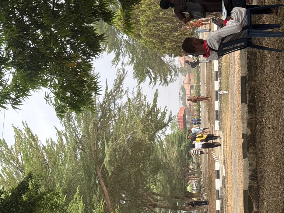 This image depicts an outdoor scene in Osu, Nigeria, characterized by abundant vegetation and human activity under an overcast sky. In the immediate foreground, a male individual is seated on a blue plastic chair with "VEGA BANK" printed on its back, engrossed with a smartphone. He wears a light-colored long-sleeved shirt with red trim and dark trousers. Partially visible to his right is another person wearing a dark top and carrying a dark shoulder bag. A concrete curb, marked with black and white stripes, separates the foreground from a wide, unpaved expanse of dry, brownish ground. The midground features a paved pathway, also delineated by black and white striped curbs, across which several individuals are walking or standing. Notable figures include two individuals walking away from the viewer in the center—one in a black top and the other in a yellow top with a backpack. To their left, another person in a striped shirt walks towards the viewer. Further right, an individual in light brown attire stands facing left. Additional figures are sparsely distributed across the open ground. The background is dominated by a long avenue of mature trees with dense green foliage, lining a path that recedes into the distance on the left. To the right, a cluster of dense green shrubs is visible. In the far background, behind the trees, various structures are present, including a large red-roofed building in the center-left, and several orange-brown buildings to the right, partially obscured by fencing. The sky is uniformly light gray, indicative of an overcast condition. Utility lines are faintly discernible across the upper portion of the frame.