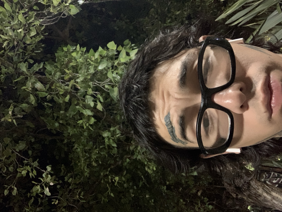 This is a vertically oriented close-up headshot of an individual, likely an adult male, captured at night in an outdoor setting within Vicente López, Argentina. The subject's face is visible from the bridge of the nose upwards. He possesses dark, shaggy hair with a prominent fringe, consistent with a mullet hairstyle. He wears black, thick-rimmed, rectangular eyeglasses and white wireless earbuds are inserted into both ears. A dark, stylized tattoo is visible above the left eyebrow, and additional dark tattoo markings are present on the left earlobe and neck. Horizontal rhytides are apparent on the forehead. The individual maintains a direct gaze towards the camera's perspective. The background is a dimly lit, dense canopy of green leaves and branches, consistent with trees or large bushes. A textured tree trunk is partially visible on the left side, and spiky plant material is present on the lower right.