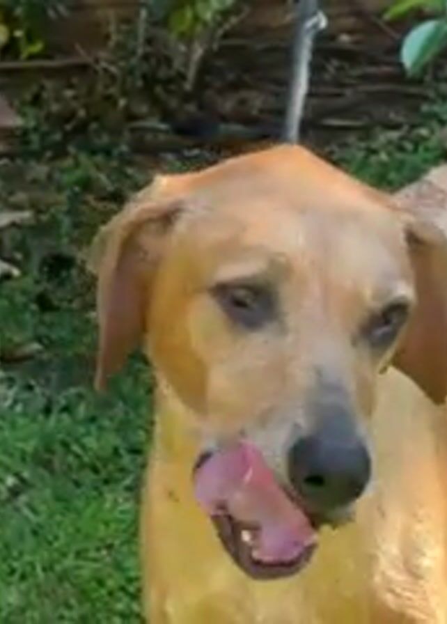 two dogs standing on a lawn, both seemingly wet. The dog in the foreground is a tan or light brown color and is on a leash. The dog has a black nose and appears to briefly stick its tongue out. The second dog, positioned slightly behind and to the left, is brown and white, and covered in what appears to be dried mud or some similar substance. Both dogs seem calm. The setting is outdoors, with green grass and foliage in the background, suggesting a yard or garden setting. The lighting suggests it's daytime.