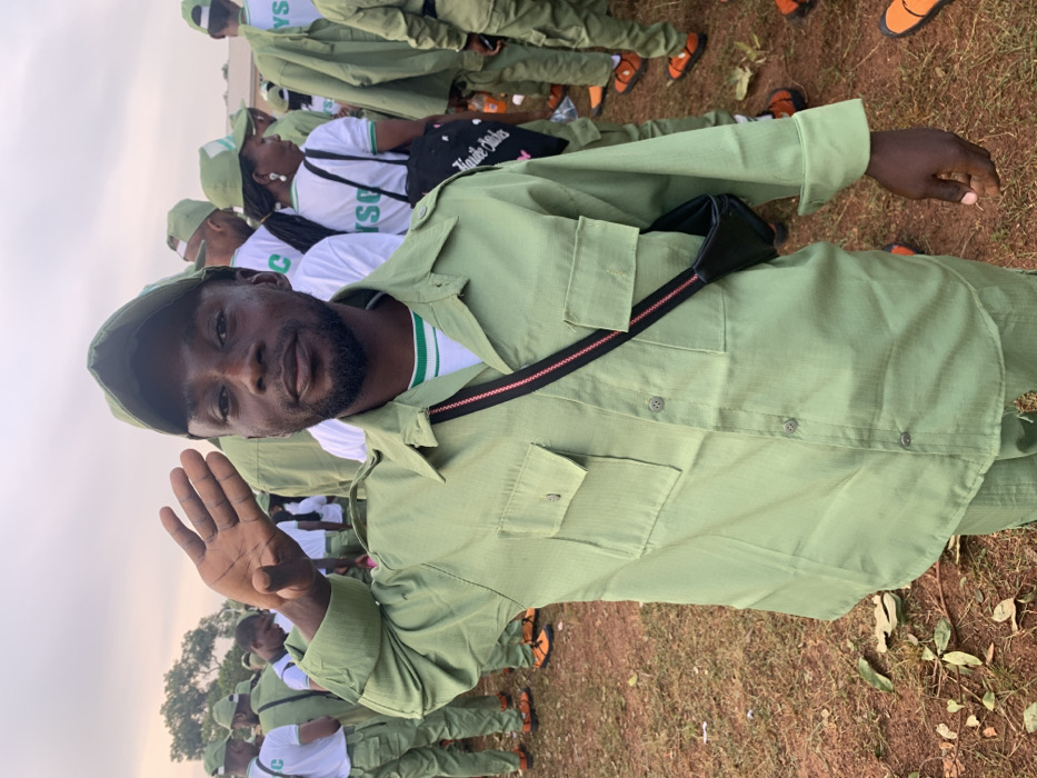 The image portrays a male individual in a light green uniform, performing a casual salute, in an outdoor setting identified as Kubi A, Nigeria