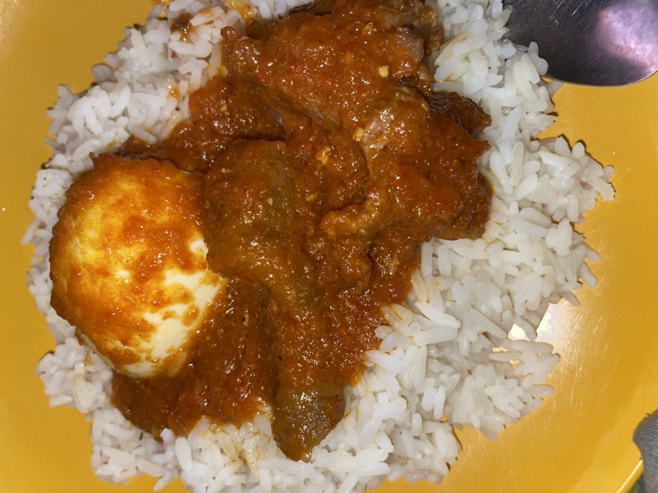 A yellow plate is filled with white rice, topped with pieces of meat covered in a reddish-brown sauce. A hard-boiled egg, also covered in the sauce, is placed on the side of the rice. A part of a metal spoon is visible at the top right corner of the plate.