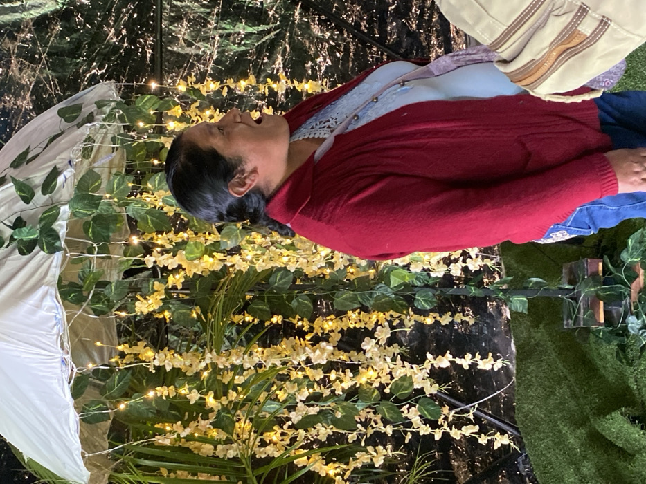 The scene, located in La Paz, Bolivia, features an adult female in profile, facing right with her mouth open. She wears a dark red cardigan over a light blue top with a crocheted neckline, and blue jeans. Her dark hair is styled in a braid. To her left, a decorative archway or canopy is present, topped by a white, inverted umbrella-like structure. From this structure, artificial green leafy vines and numerous strands of small, yellowish-white flowers hang, illuminated by intertwined warm white string lights. The ground in the foreground is covered with artificial green turf, featuring a dark, vine-wrapped decorative stand on a small wooden base in the lower left. A portion of a light-colored bag or garment belonging to another individual is visible in the lower right foreground. The background beyond the decorative elements is dark and indistinct.