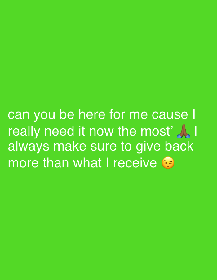 The image displays a light green background with a message in white text. The message reads: "can you be here for me cause I really need it now the mostβ ππ½ I always make sure to give back more than what I receive π." It appears to be a personal request for support, followed by a statement about being generous in return. The praying hands and winking face emojis add emotional context to the text.