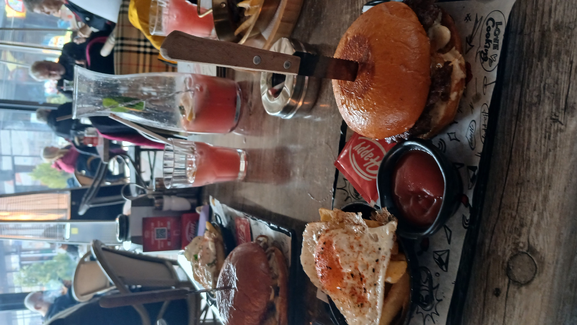 The image displays a dining table within an indoor restaurant or cafe setting in Sofia, Bulgaria. In the immediate foreground, two distinct meals are presented on dark rectangular trays lined with white paper featuring "Love v Cooking" branding. The closest meal features a hamburger with a wooden-handled knife impaled vertically through its top bun. This is accompanied by a small black bowl filled with red ketchup and a red, branded "Happy" sachet. Adjacent to this, another black bowl contains a serving of french fries topped with a fried egg, visibly seasoned with red flakes. Further back on a separate tray, a second hamburger is visible, secured by a skewer. The dark wooden table surface also holds multiple glasses and a clear pitcher, all containing a pink-red beverage garnished with lemon/lime slices and mint leaves. A metallic, circular ashtray is situated on the table near the center. The background, viewed through large windows, reveals an outdoor patio area containing a tall, lit patio heater and several blurred individuals seated at tables, appearing to be dining or socializing.