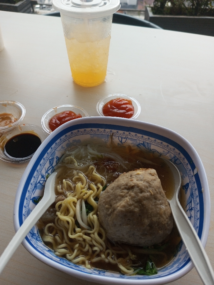 A bowl of noodle soup with a large meatball dominates the foreground. Accompaniments include small containers holding soy sauce, peanut sauce, and two types of chili sauce. A tall plastic cup filled with orange liquid sits behind the bowl. A white table surface provides the backdrop for the food arrangement. Outdoor scenery is vaguely visible through a distant window.