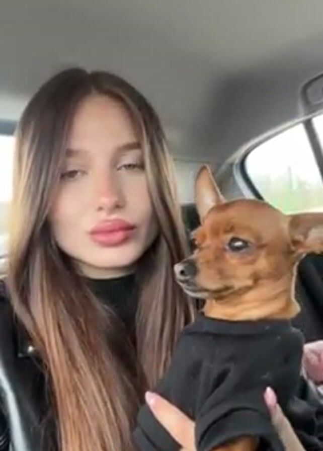 young woman sitting in a car, holding a small, brown dog. The woman has long brown hair with a touch of ombre, wearing a black leather jacket and black sweater. She has light skin, green eyes, and full pink lips. The dog is wearing a black sweater. The woman puckers her lips as if to kiss the dog. The car's interior is visible in the background. Outside the car window, there's a glimpse of greenery.