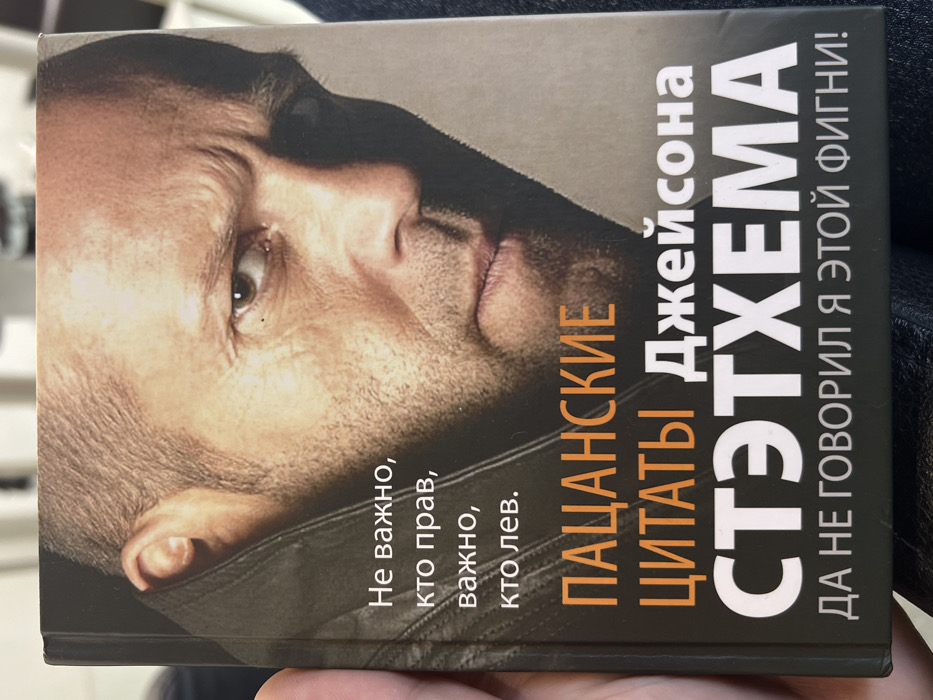 A book with a cover featuring a close-up image of actor Jason Statham's face is held vertically by a person's left hand