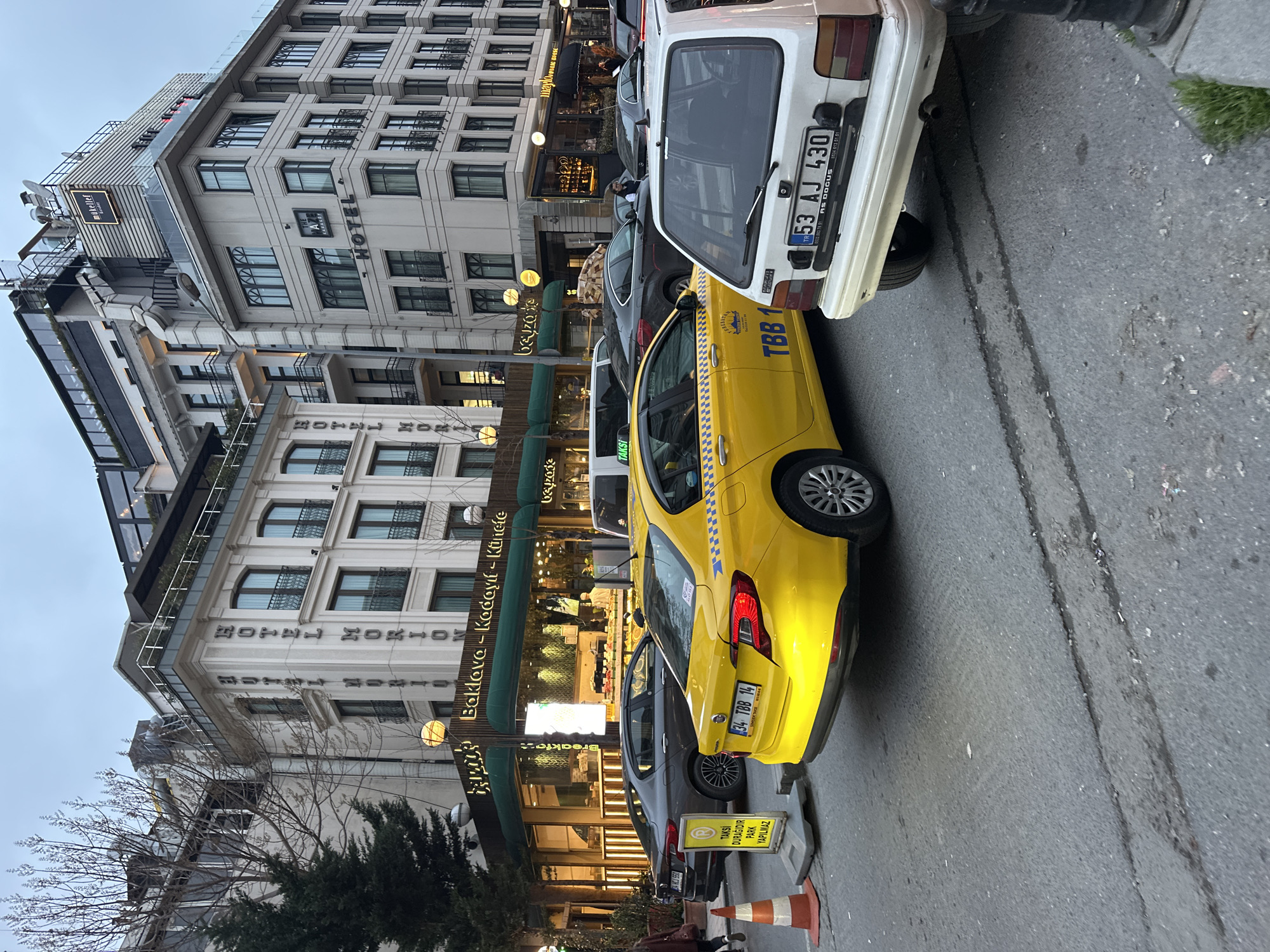 The image displays an urban street scene in Beyoğlu, Istanbul, Turkey, under an overcast sky or during twilight, characterized by commercial activity and multi-story buildings. In the mid-ground, a bright yellow Fiat Egea taxi, license plate "34 TBB 14," is oriented with its rear towards the viewer, featuring a checkered decal on its side and "TAKSİ" signage on its roof. To the right of the taxi, an older model white sedan, license plate "53 AJ 430," is parked, also showing its rear. To the left of the yellow taxi, a dark grey sedan, license plate "34 HLJ 550," is parked parallel to the curb. Multiple other vehicles, including a white taxi van, are visible in traffic or parked further down the street. The left side of the street is dominated by a multi-story, light-colored building identified by vertical signage as "HOTEL MORION." Its ground floor houses a brightly illuminated establishment labeled "Baklava - Kadayıf - Künefe," displaying various pastries. A pedestrian wearing dark clothing is partially visible walking on the sidewalk adjacent to this building. Bare tree branches and a small evergreen tree are present on the sidewalk. On the right side of the street, another multi-story, light-colored building is visible, identified as "THE AZ7 HOTEL," featuring dark-framed windows and small balconies. A rooftop structure with a "makellef" sign is visible atop this building. Street furniture includes several spherical streetlights, an orange traffic cone, and a yellow sign with a gray base that reads "TAKSİ DURAĞIDIR PARK YAPILMAZ" (TAXI STAND, NO PARKING). The asphalt road surface exhibits wear, cracks, and minor debris.