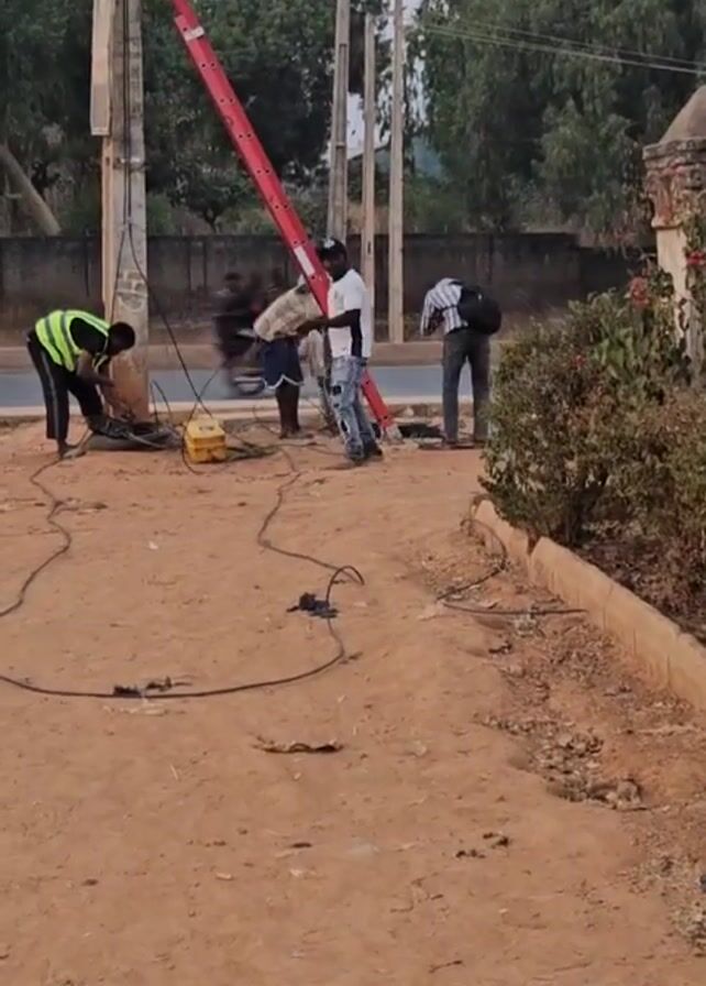 group of four men working on wires near a utility pole beside a street. One man is wearing a reflective safety vest, and is bent over, working with wires and a yellow box on the ground. Another man is wearing a white t-shirt, blue jeans and a black baseball cap and stands beside a red ladder, which is leaning against the utility pole. A third man in a plaid shirt and jeans bends down near a hole in the ground with wires coming from it. The fourth man, who is wearing a blue t-shirt and shorts is beside the ladder. There are overhead power lines, trees in the background, and a decorative concrete wall and plants on the right. The ground is a reddish-brown dirt, and there are a number of wires strewn across the ground.