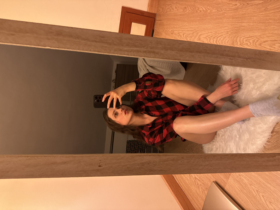 The image depicts an indoor mirror selfie taken in what appears to be a residential room in Cava de' Tirreni, Italy. A young adult female is visible in the reflection of a tall, vertical mirror with a light wood-toned frame. She is seated on a small, white, fluffy faux-fur rug, which is placed on a light-colored wooden floor. Her legs are bent, with her left leg crossed over, and she is wearing light grey ankle socks. The subject is dressed in an oversized red and black buffalo plaid button-up shirt, which extends to approximately mid-thigh. Her right arm is extended, holding a dark-colored smartphone (featuring multiple rear cameras) pointed towards the mirror to capture the image. Her left arm rests on her left leg. She has long, wavy brown hair and is looking slightly to her right, with her lips parted. The reflected background behind her includes a dark-colored dresser or cabinet in the upper-mid section and part of a bed with a light-colored duvet or blanket to her left. A patterned dark fabric is partially visible near the bed. To the right of the reflection, a brown wooden picture frame or similar rectangular object leans against a wall on the wooden floor. The visible wall outside the mirror's frame on the left side of the image is a plain, light peach or orange color, with a matching baseboard. A silver-colored laptop is partially visible on the wooden floor to the far left, outside the mirror's reflection. The lighting is dim, suggesting an indoor evening or subdued light setting.