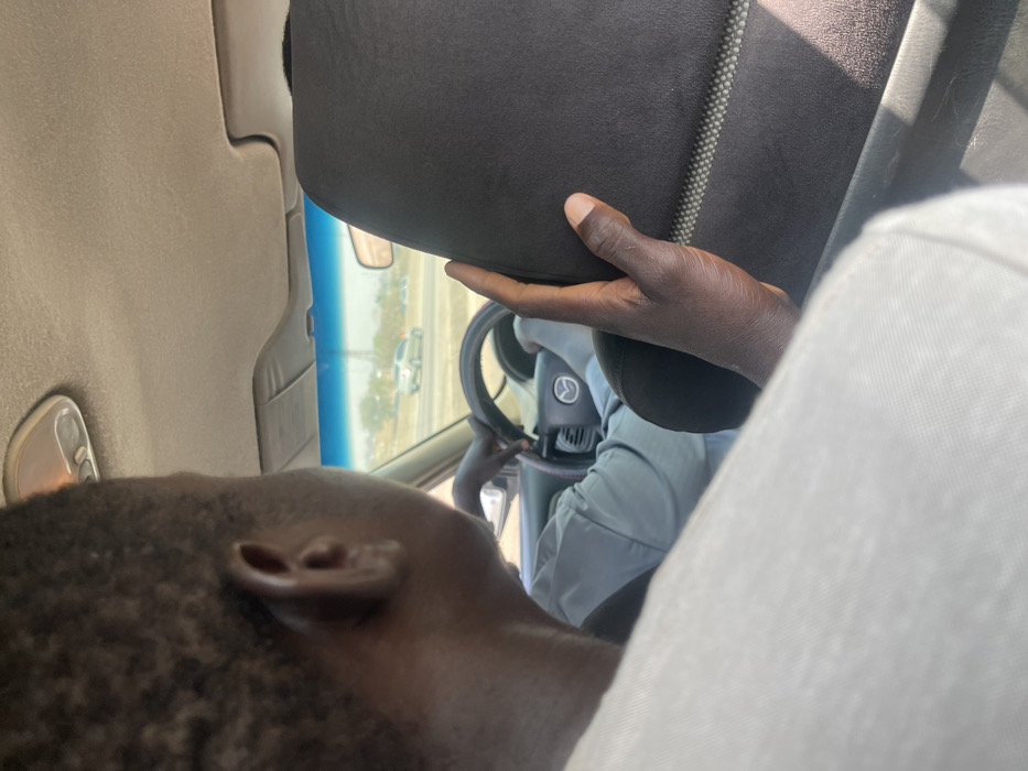 An interior view of a vehicle in Karmajiji, Nigeria, captured from the rear passenger seat, looking forward