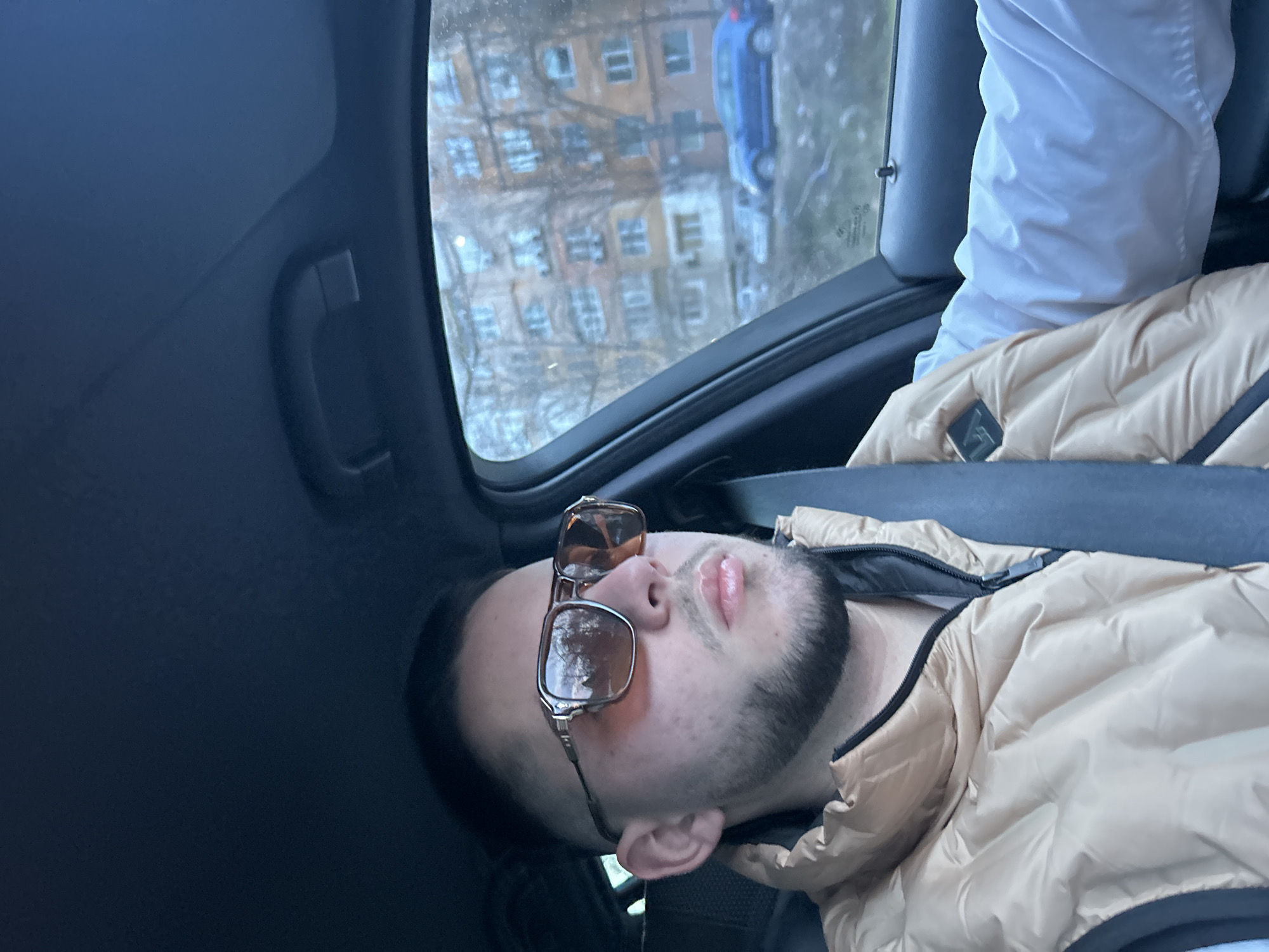A male individual is seated inside a vehicle, positioned as a driver or front-seat passenger