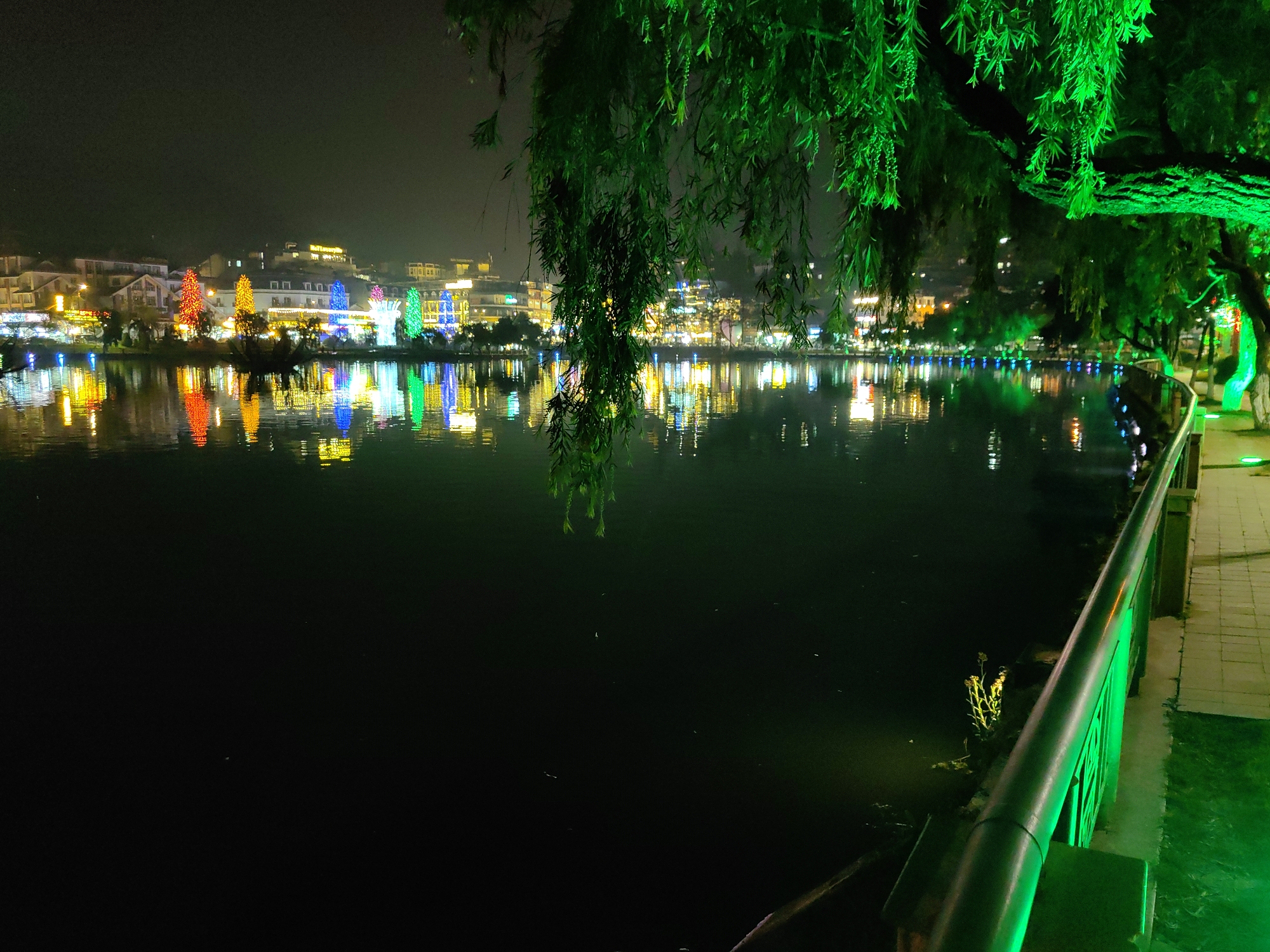 The image displays a nighttime view of Sa Pa Lake (Hồ Sa Pa) in Sa Pa, Vietnam. The scene is illuminated by artificial lights emanating from the surrounding city. In the foreground, on the right side, a paved walkway is visible, bordered by a dark green metal railing. A large tree, characterized by numerous drooping, green leaves, extends from the upper right corner, partially overhanging the lake. This tree's foliage and visible branches are brightly illuminated with a distinct green light. The central and lower portions of the frame are dominated by the dark, calm surface of Sa Pa Lake. The lake prominently reflects the diverse and vibrant artificial lights from the buildings on the far shore. The background reveals the city's skyline along the opposite bank of the lake. Multiple-story buildings, consistent with hotels and commercial establishments, are brightly lit with a variety of colors, including warm white, yellow, blue, and green. Several decorative light installations, shaped like conical trees, are visible among the buildings, displaying distinct red, orange, blue, purple, and green illumination. These urban lights create a luminous and colorful spectacle, mirrored vividly on the lake's surface. The sky above the city is dark, indicating a clear night. No individuals are present in the image, and no specific actions or interactions are depicted. The overall environment is an urban lake setting at night, characterized by extensive artificial lighting.
