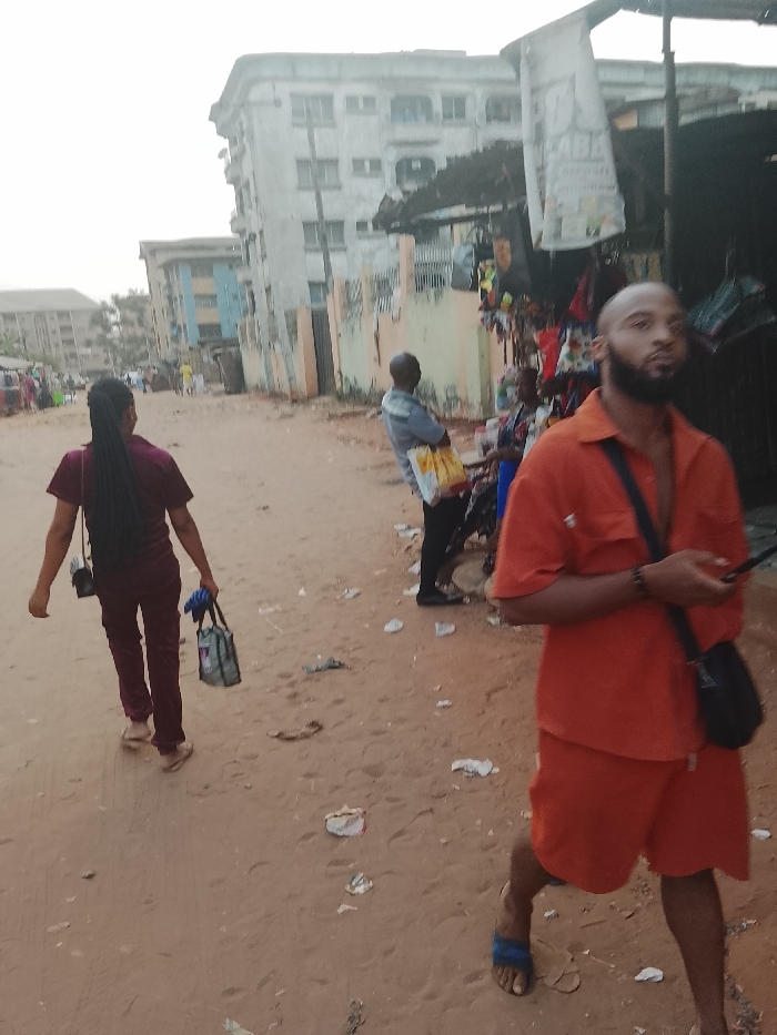 A man in an orange shirt and shorts walks on a dirt road, looking to the right while holding a phone. A woman in maroon scrubs walks in the opposite direction, carrying bags. A man stands in the background near a building. There is litter on the ground. A building is in the background.