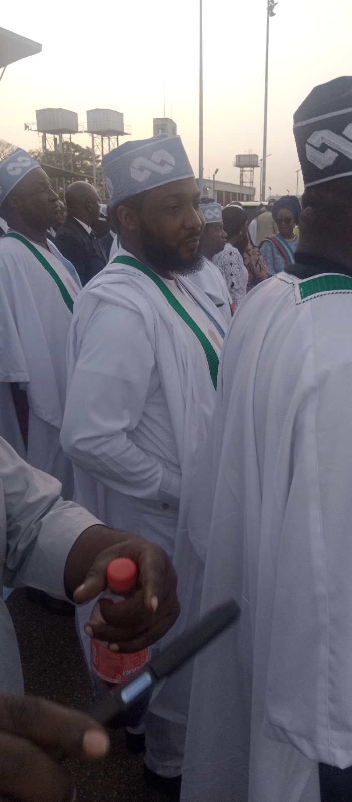 A group of men wearing matching white robes and patterned light blue caps. The robes have green and white trim. They are standing outdoors with buildings and infrastructure in the background. The lighting suggests either sunrise or sunset. One person is holding a plastic bottle of soda and a pen.
