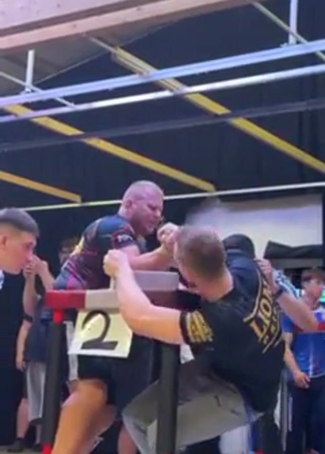 Two men are arm wrestling in front of an audience. They are positioned at a table with a large number "2" on its side. The man on the left has a shaved head, a reddish-purple shirt with black accents, and black shorts. The man on the right is wearing a black T-shirt with a large gold design and gray sweatpants. The arm wrestling match is intense, with both men straining. The audience is close, with several people recording on their phones. The environment is an indoor event space, with a low ceiling supported by wooden beams and visible electrical wiring.