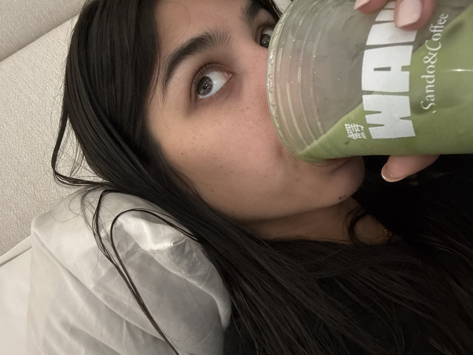 A woman with dark hair is seen from a close-up angle, likely lying down with her head on a pillow. She's drinking from a large clear plastic cup containing a green liquid, possibly a smoothie. The cup has the brand name "MAKI Sando & Coffee" printed on it. Her gaze is directed slightly upward and to the left, with a surprised expression. Freckles are visible on her face. Her left hand holds the cup.