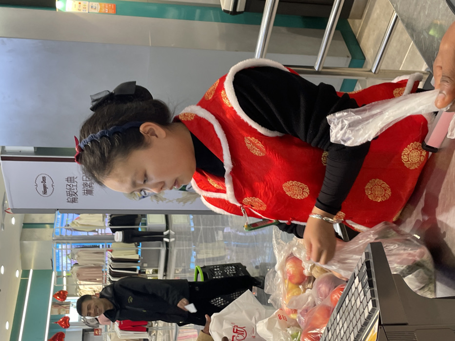 The scene depicts an interior view of a retail establishment, likely a supermarket or department store, located in Jiangjin, China. In the foreground, a female store employee with dark hair styled with a blue scrunchie and black bow clip stands behind a counter, facing left. She wears a black long-sleeved shirt under a red sleeveless vest with white faux-fur trim and gold patterned circular motifs, some displaying the "double happiness" character (囍). A silver-colored bracelet is on her left wrist. Her hands are engaged with clear plastic bags containing produce, including apples and other fruits, resting on the gray counter. A dark-skinned hand is visible in the lower right, receiving a clear plastic bag from the employee. To the left on the counter, a black keyboard is visible. A pink and black cylindrical object, resembling a vape pen, is partially visible on the counter near the employee's right hand. In the midground, a smiling male individual in a dark hooded jacket and dark pants stands behind the customer, holding a white rectangular object in his left hand. A dark shopping basket is near his feet. The background reveals rows of clothing racks displaying various garments, with mannequins visible. A tall white sign prominently displays the "Haagen-Dazs" logo and Chinese text. The store features bright overhead lighting, reflective light-colored flooring, and light blue and gray structural elements. Red heart-shaped balloons are suspended from the ceiling in the far background.