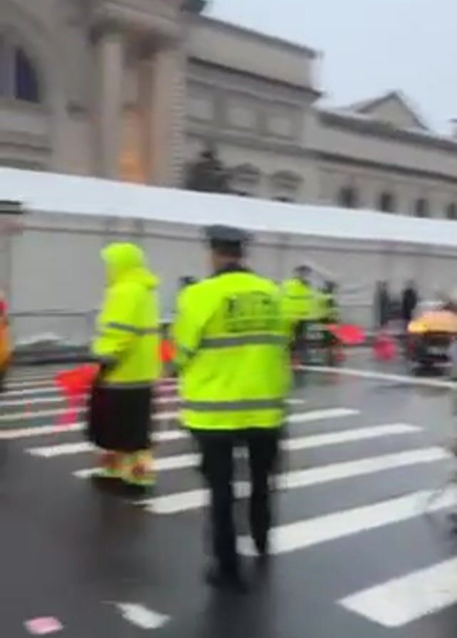 crowd of people gathered behind a metal barrier, possibly at an event. In front of them, a yellow taxi drives past, and a person in a bright yellow and black safety suit directs traffic with a red flag. Beyond the road, a large white sign with the words "SUPERFINE: TAILORING BLACK STYLE" is visible. Behind the sign, there is a staircase decorated with white flowers, where several people are standing, presumably attending the event. The weather appears to be overcast and possibly rainy.