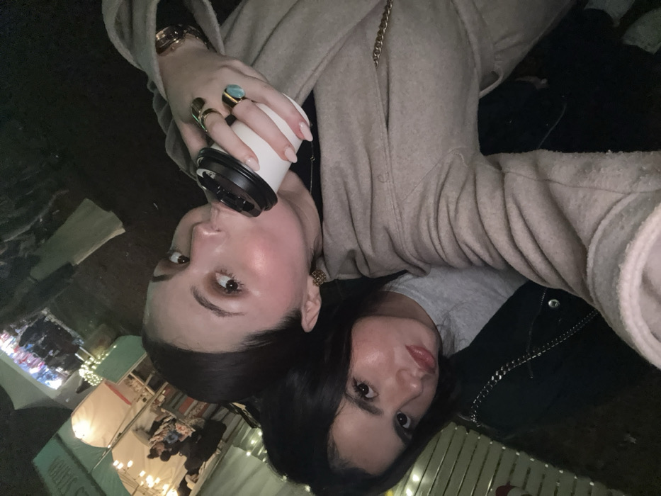 Two women pose for a selfie outdoors. One is drinking from a white coffee cup with a black lid. She wears a tan coat and several rings, including one with a large turquoise stone. Her dark hair is pulled back. The other woman has long, dark hair and wears a gray shirt and a black jacket with a silver chain detail. In the background, there are tents and lights suggesting a market or festival. The image is rotated.
