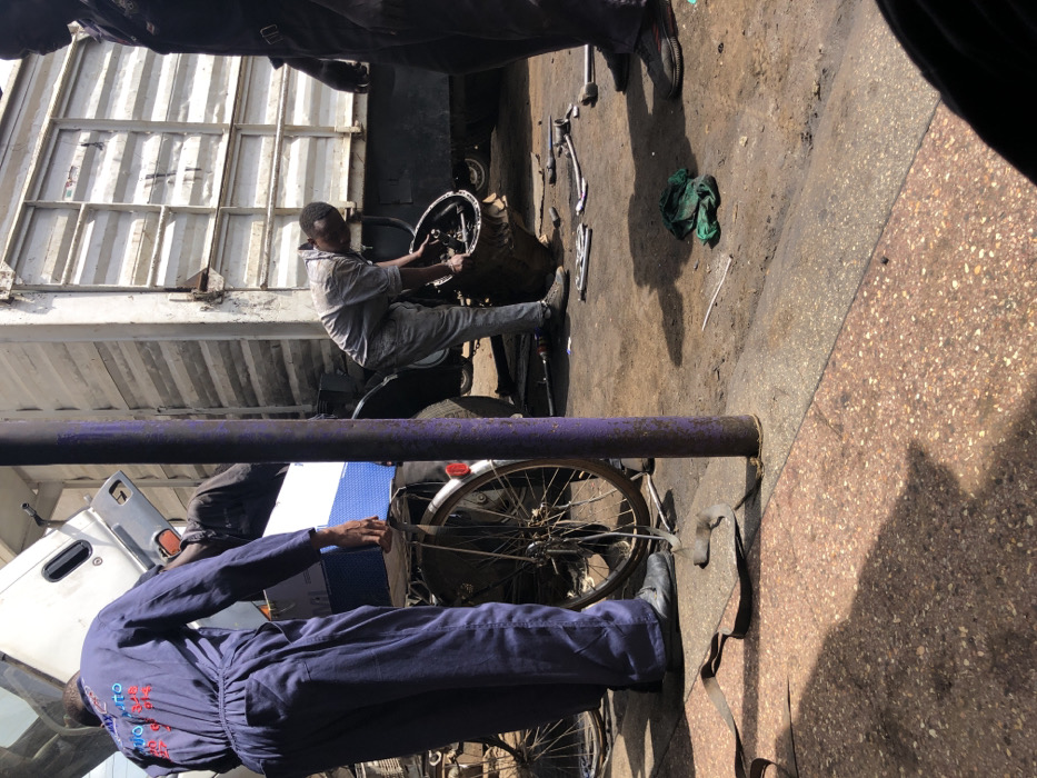 The scene depicts an outdoor auto repair workshop located in Hospital ward, Kenya, under clear daylight conditions