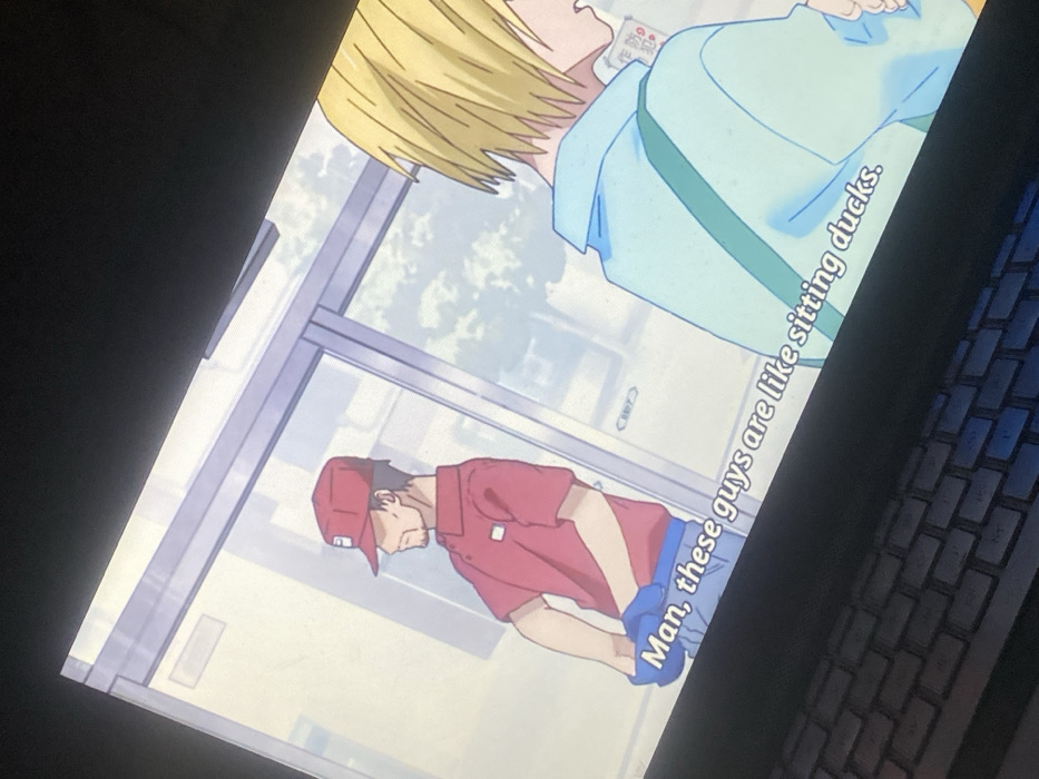 This image, captured in Birnin Kebbi, Nigeria, displays a digital screen, likely a laptop, angled upwards with a portion of a black keyboard visible in the foreground. The screen presents an animated scene featuring two male characters and text subtitles. On the left, an animated male figure with light skin, a short dark beard, and a red baseball cap with a white logo is depicted in profile, facing right. He wears a red short-sleeved collared shirt with a white tag on the left chest and blue jeans. His hands are positioned near his waist/pelvis area, partially obscured. To the right, a second animated male figure is seen from the back and left side, possessing light blonde hair. He wears a light blue short-sleeved shirt with a darker blue or green strap extending from his right shoulder. This character is angled towards the left. The animated background suggests an interior location with large glass panels or doors, through which blurred green foliage is visible, implying an exterior environment beyond. White subtitles with a black outline are displayed across the bottom of the animated scene, reading: "Man, these guys are like sitting ducks."