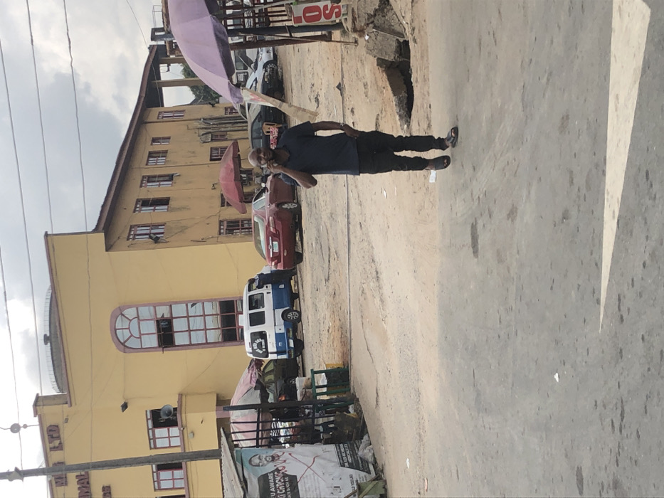 The image depicts a street scene in Owerri, Nigeria, characterized by urban infrastructure and informal market activity under an overcast sky