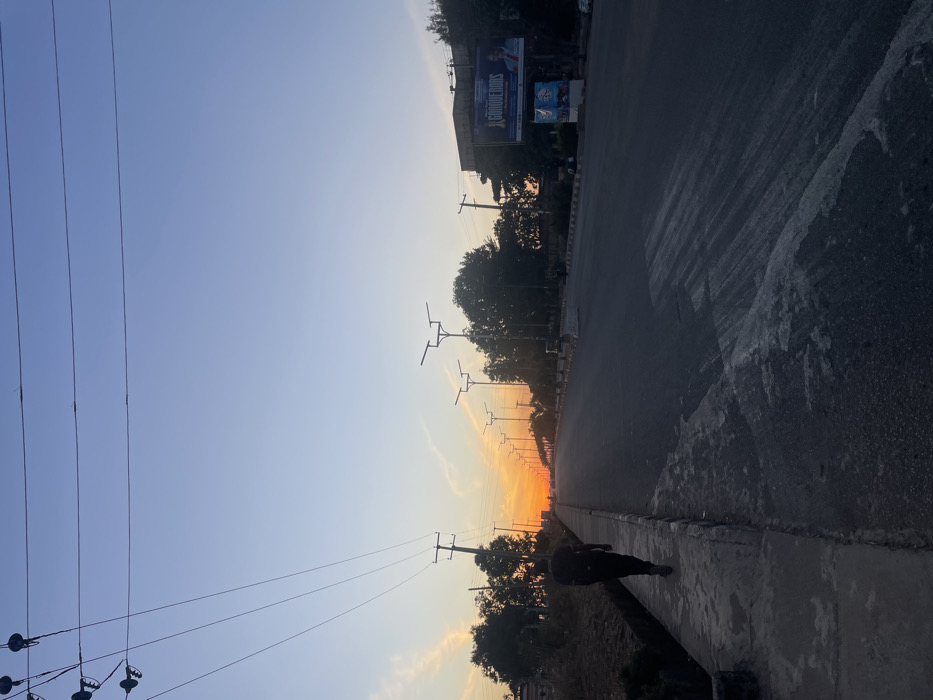 A serene landscape captures a sunset over a road lined with trees and modern streetlights. Power lines stretch across the sky, contrasting with the vibrant orange glow on the horizon. A lone figure walks along the sidewalk, adding a sense of scale to the scene. In the background, a building with a prominent billboard overlooks the road. The asphalt shows wear and tear, with visible crosswalk markings.