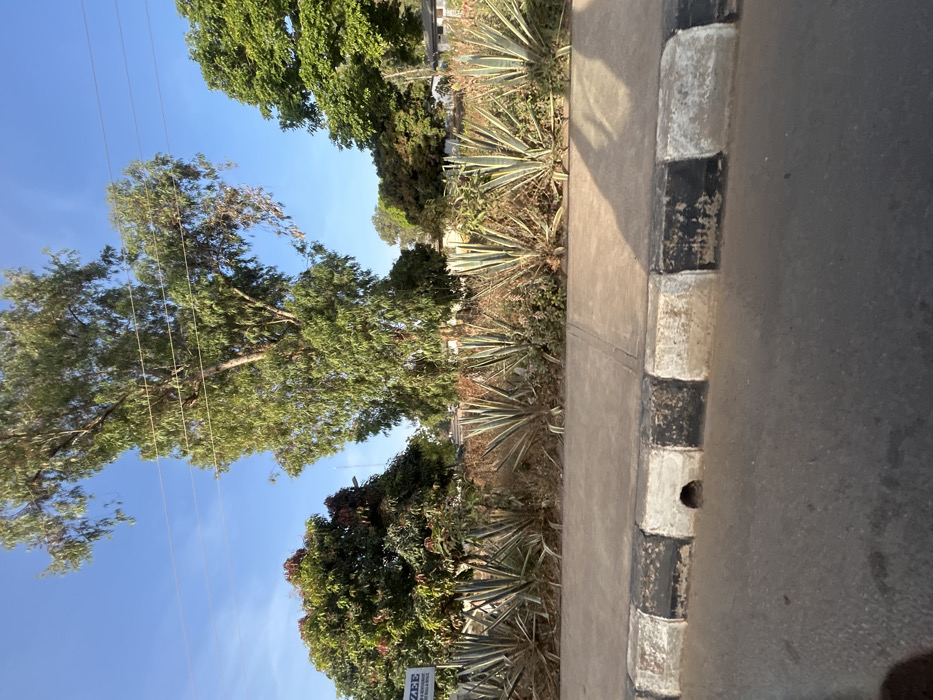 A sidewalk with black and white curb stones edges a street. Green trees and agave plants line the sidewalk, reaching toward a blue sky. Power lines stretch across the upper part of the frame. The scene appears to be taken in the late afternoon, with long shadows cast on the sidewalk and street.