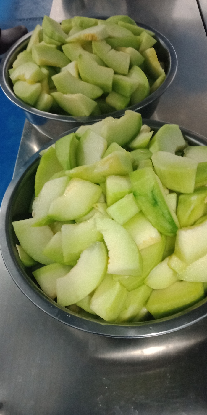 In Ciherang, Indonesia, two stainless steel bowls filled with numerous light green, wedge-shaped pieces of peeled fruit or vegetable are positioned on a reflective stainless steel surface