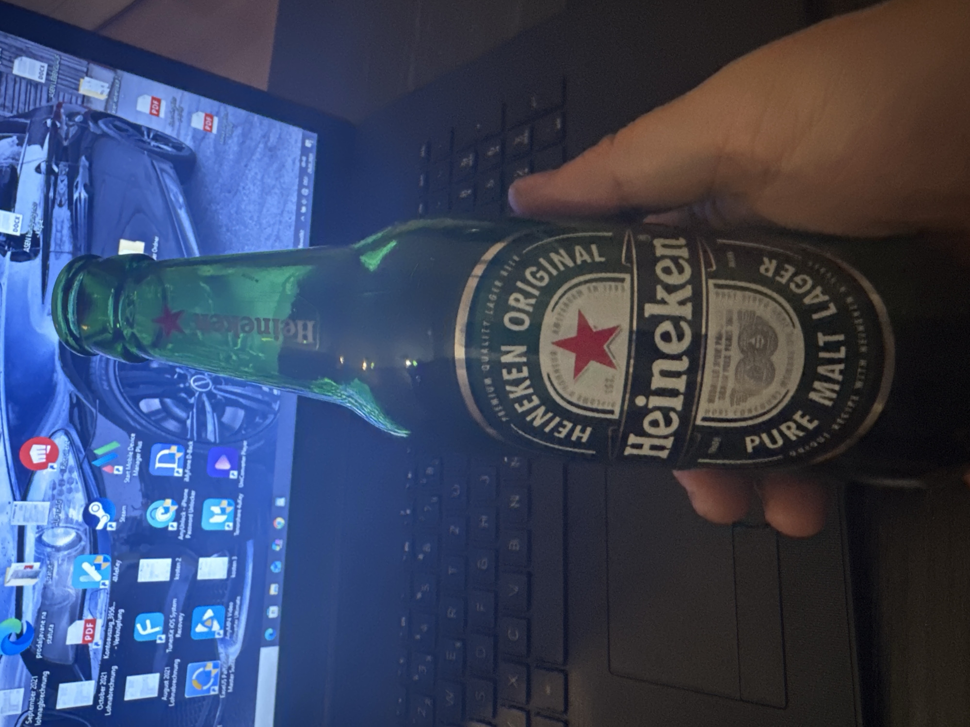 hand holding a bottle of Heineken beer over a laptop. The laptop screen displays a desktop interface with various icons and a car as a wallpaper. The keyboard of the laptop is visible beneath the bottle. The image does not provide any information about the location or any people present besides the hand holding the bottle.