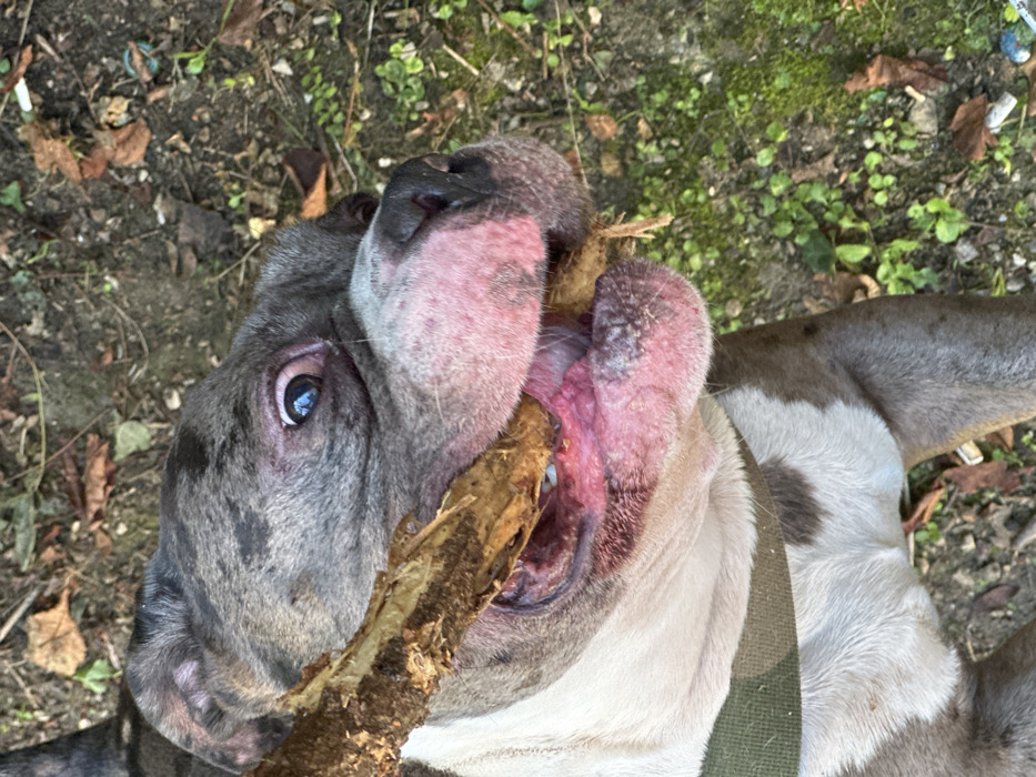 - "The image displays a close-up, high-angle view of a merle-coated canine, consistent with an American Bully or pitbull-type breed, engaging with a stick in an outdoor environment in the city of Stains, France" by FM-clbjN2, licensed under CC BY 4.0