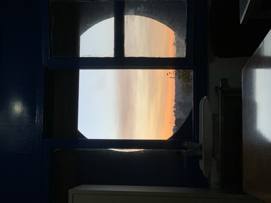 The image depicts an interior view looking out through a window onto an urban landscape during either sunrise or sunset in Fez, Morocco. In the foreground, a dark, reflective surface, likely a wooden table, occupies the bottom edge of the frame. Above this, a dark counter runs beneath the window. On this counter, a white, elongated object, possibly a shallow basin or tray, holds two dark, cylindrical bottles or dispensers. To the far left, a portion of a light-colored, possibly white, cabinet or locker is visible. The immediate interior around the window frame is dark, appearing to be painted a deep blue or black. The window itself features a dark frame, likely wood or metal, with multiple panes. The central pane is rectangular and provides the clearest view of the exterior. To the right, another pane exhibits a distinctive architectural element: a large, partially visible semicircular or circular cutout in the frame, giving the window a unique design. The window glass appears somewhat aged or smudged. Through the window, the sky transitions from a light blue at the top, through soft pink and orange hues in the middle, to a golden yellow closer to the horizon, indicating the time of day. Below the horizon, a dense cityscape spreads out, characterized by numerous buildings and interspersed trees and foliage. Several thin, vertical structures, possibly communication towers or distant minarets, punctuate the skyline. A prominent tree with visible autumnal foliage is situated to the right, below the distinct window feature. The overall atmosphere outside appears slightly hazy over the distant city of Fez.