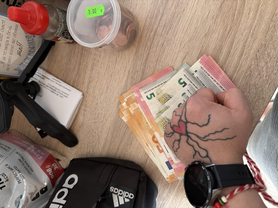 The scene is an indoor, overhead view of items placed on a light wood-grain surface, located in Kermen, Bulgaria. A left hand is prominently featured in the lower center, holding a fan of Euro banknotes, consisting of multiple 50 Euro and 5 Euro notes. The hand bears a tattoo on its dorsal side depicting a red heart from which black, vein-like lines extend. A black smart watch with a circular face and strap is worn on the left wrist, along with a red and white braided bracelet. To the upper left, a black Adidas brand bag with white lettering is visible, alongside a white flexible container labeled "PERFECT WPC," "STRAWBERRY ICE CREAM," and "908g." A small black tripod stands behind these items, partially obscuring a white paper or booklet with Cyrillic text. In the upper right, a clear plastic bottle with a red flip-top cap is present. To the right, a clear plastic container holds numerous copper-colored coins, and a green sticker with "1.00" is affixed to its side.