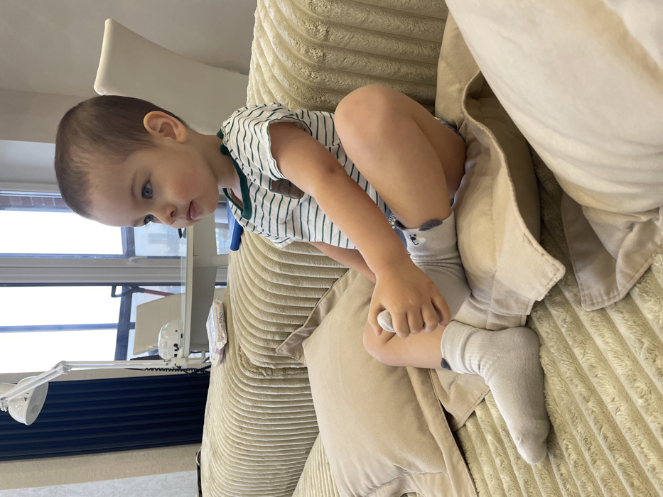 An indoor scene depicts a young child seated on a beige, horizontally ribbed sofa. The child possesses light skin, short brown hair, and blue eyes, wearing a white t-shirt with thin green horizontal stripes and a brown graphic, light-colored shorts, and light grey socks featuring dark grey animal faces at the ankles. The child's legs are crossed, with the left hand gently resting on the right ankle. Their gaze is directed towards the right, out of frame, with a neutral expression. On the sofa to the child's left, a light-colored pillow is present, and a packaged item, possibly wipes, rests further back on the sofa. The background reveals a large window providing natural light and a blurred view of a distant urban environment. Below the window, a white desk is visible, featuring a white multi-jointed task lamp and a small white electronic device. A white chair is positioned behind the desk. Dark vertical blinds are present to the left of the window. The setting is a contemporary residential interior. Specific identifying features to pinpoint a precise location within the city of Izhevsk, Russia, are not discernible from the image.